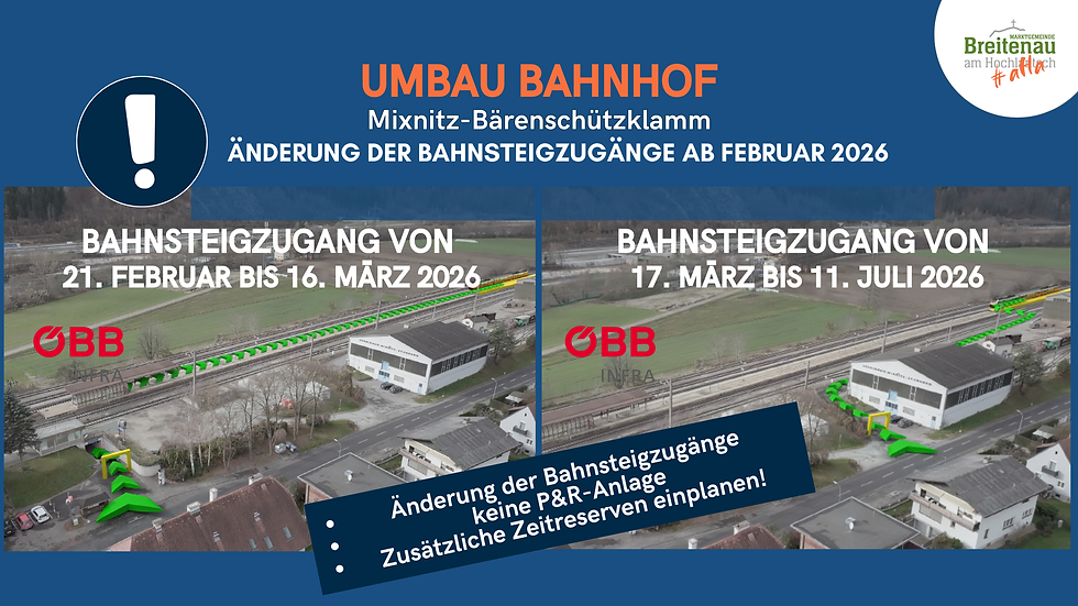 Der Bahnhof Mixnitz-Bärenschützklamm wird bis 2027 umfassend modernisiert, um den steigenden Anforderungen gerecht zu werden. Ziel ist ein barrierefreier, attraktiver und moderner Bahnhof, der den Bedürfnissen der Fahrgäste entspricht.